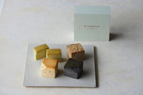 日本で親しまれてきた素材を使用した、和のアソートセット。柚子の芳醇な香りと心地よい酸味を楽しめる「柚子オリーブ」、濃厚で香ばしい味わいを生かした「黒胡麻バニラ」、北海道産の枝豆にジャスミンライスを合わせた濃厚な味わいの「ずんだジャスミン」、メープルシロップの旨味ときなこの香ばしい味わいを楽しめる「きなこメープル」のキューブ型チーズケーキをオリジナルのボックスに詰めました。